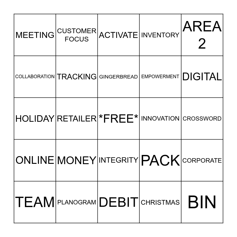 This bingo card has a free space and 24 words: MONEY, PLANOGRAM, GINGERBREAD, TEAM, AREA 2, MEETING, COLLABORATION, CUSTOMER FOCUS, INNOVATION, INTEGRITY, EMPOWERMENT, HOLIDAY, PACK, CORPORATE, TRACKING, CHRISTMAS, CROSSWORD, ACTIVATE, DIGITAL, RETAILER, BIN, ONLINE, INVENTORY and DEBIT.