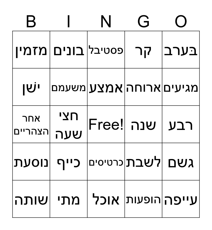 This bingo card has a free space and 50 words: חגים, עייפה, ארחים, אוכל, כייף, אחר, בונים, מכינים, ישׁן, מחנה, משעמם, קר, גשם, לשבת, מצטער, נגמר, אמצע, שנה, בּחינות, בּערב, חצי שעה, הופעות, מזמין, ארוחה, מצוין, מוצאי שבת, מגיעים, יום ראשון, פסטיבל, כרטיסים, להקה, יום רביעי, בא, בטח, מתי, החיים, עולם, כל רגע, צהריים, רבע, קם, מאוחר, יוצא, שונא, שותה, אחר הצהריים, מתחיל, טיול, נוסעת and הפסקה.