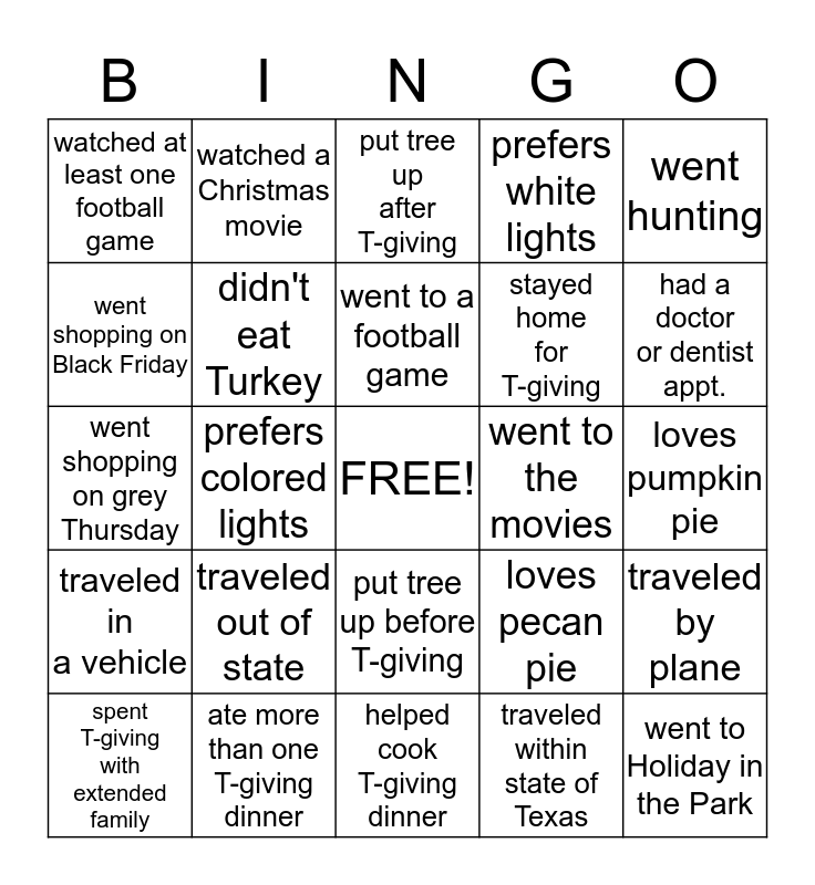 This bingo card has a free space and 24 words: traveled out of state, ate more than one T-giving dinner, went to a football game, spent T-giving with extended family, went hunting, watched at least one football game, went shopping on Black Friday, watched a Christmas movie, went to the movies, put tree up before T-giving, stayed home for T-giving, went shopping on grey Thursday, loves pecan pie, traveled by plane, didn't eat Turkey, traveled within state of Texas, loves pumpkin pie, put tree up after T-giving, had a doctor or dentist appt., prefers colored lights, went to Holiday in the Park, traveled in a vehicle, prefers white lights and helped cook T-giving dinner.