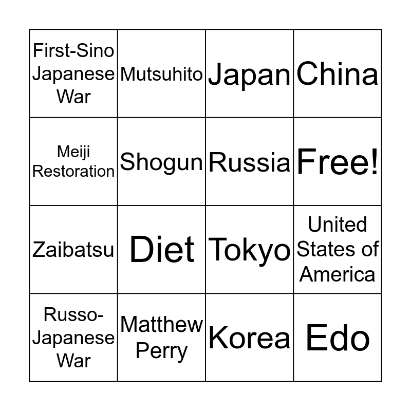 This bingo card has 18 words: Diet, Edo, Japan, First-Sino Japanese War, Tokyo, China, Russo-Japanese War, Mutsuhito, Free!, Zaibatsu, Korea, Meiji Restoration, United States of America, Shogun, Russia, Tokugawa, Matthew Perry and Meiji.