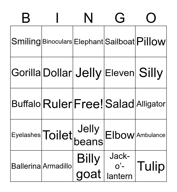 This bingo card has a free space and 36 words: Balloon, Bowling, Collar, Dollar, Elbow, Eyelashes, Jelly, Necklace, Pillow, Pilot, Ruler, Sailboat, Sailor, Salad, Silly, Smiling, Stroller, Toilet, Tulip, Elephant, Alligator, Ambulance, Armadillo, Ballerina, Billy goat, Binoculars, Buffalo, Caterpillar, Eleven, Gorilla, Halloween, Helicopter, Jack-o’-lantern, Jelly beans, Juggler and Marshmallow.