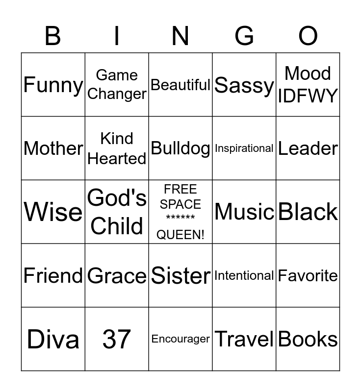 This bingo card has a free space and 29 words: Diva, Lover, God's Child, Productive, Funny, Beautiful, Kind Hearted, Grace, Music, 37, Black, Books, Encourager, Travel, Leader, Movies, Sister, Friend, Mood IDFWY, Wise, Intentional, Starbucks, Inspirational, Mother, Sassy, Game Changer, Favorite, Bulldog and Lumberjack.