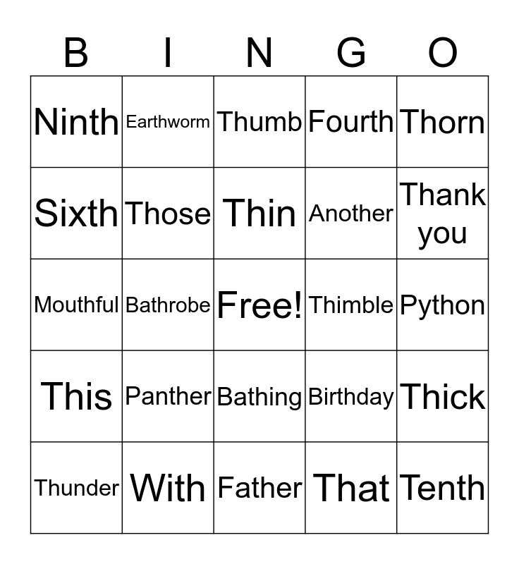 This bingo card has a free space and 60 words: With, With, With, This, That, They, Those, Them, Another, Another, Fourth, Fith, Sixth, Seventh, Eighth, Ninth, Tenth, Thorn, Things, Thin, Thimble, Thumb, Thunder, Thick, Thigh, Thousand, Thief, Think, Thank you, Thirsty, Therapy, Thatch, Thicket, Bathtub, Earthworm, Athlete, Bathrobe, Bathrobe, Bath towel, Mouthful, Plaything, Panther, Python, Toothpaste, Birthday, Marathon, Stethoscope, Toothless, Feather, Bathing, Father, Mother, Weather, Bathing suit, Rhythm band, Together, Gathering, Brothers, Clothing and Weatherman.