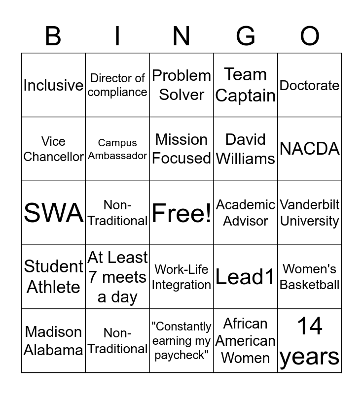 This bingo card has a free space and 24 words: At Least 7 meets a day, Non-Traditional, Mission Focused, Madison Alabama, Doctorate, Inclusive, Vice Chancellor, Director of compliance, Academic Advisor, Work-Life Integration, David Williams, SWA, Lead1, Women's Basketball, Campus Ambassador, African American Women, Vanderbilt University, Problem Solver, NACDA, Non-Traditional, 14 years, Student Athlete, Team Captain and "Constantly earning my paycheck".