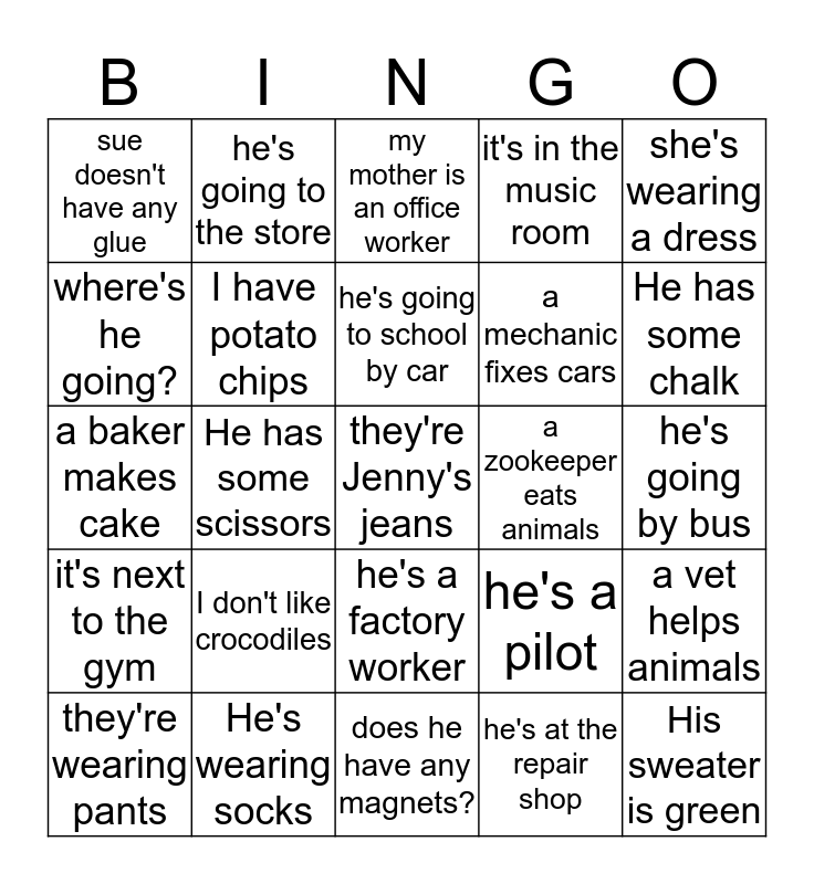 This bingo card has 25 words: I don't like crocodiles, does he have any magnets?, he's going to school by car, they're wearing pants, she's wearing a dress, sue doesn't have any glue, where's he going?, he's going to the store, a zookeeper eats animals, he's a factory worker, a mechanic fixes cars, a baker makes cake, he's a pilot, a vet helps animals, I have potato chips, His sweater is green, he's going by bus, my mother is an office worker, He has some chalk, He has some scissors, they're Jenny's jeans, He's wearing socks, it's next to the gym, it's in the music room and he's at the repair shop.