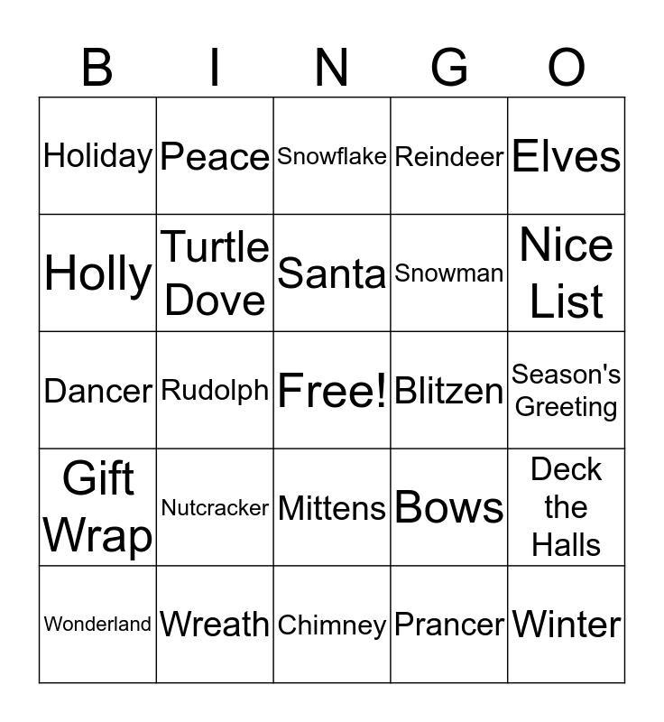 This bingo card has a free space and 59 words: Dasher, Wreath, Christmas, Gift Wrap, Prancer, Decorations, Turtle Dove, Ornament, Snowman, Jack Frost, Reindeer, Grinch, Holly, Vixen, Candy Cane, Holiday, Winter, Elves, Mrs. Claus, Santa, Blitzen, Snowflake, Wonderland, Deck the Halls, Mistletoe, Stocking, Christmas Tree, Star, Nice List, Jingle, Sugar Plums, Naughty List, Fireplace, Gingerbread, Peace, Cookies, Toys, Rudolph, Frosty, Dancer, Sugar, Nutcracker, Season's Greeting, Cupid, Present, Comet, Garland, Bell, Mittens, Chimney, Ribbon, String of Lights, Sleigh, Noel, North Pole, Bows, Joy, Donner and Scarf.