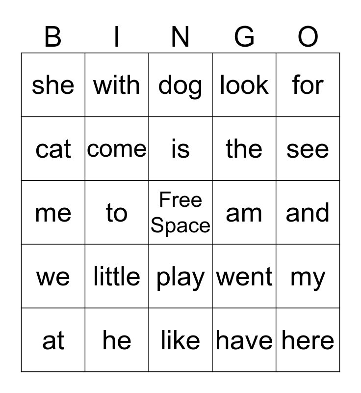 This bingo card has a free space and 24 words: little, he, is, at, for, she, cat, with, am, play, the, me, went, my, come, have, and, dog, see, to, here, we, look and like.