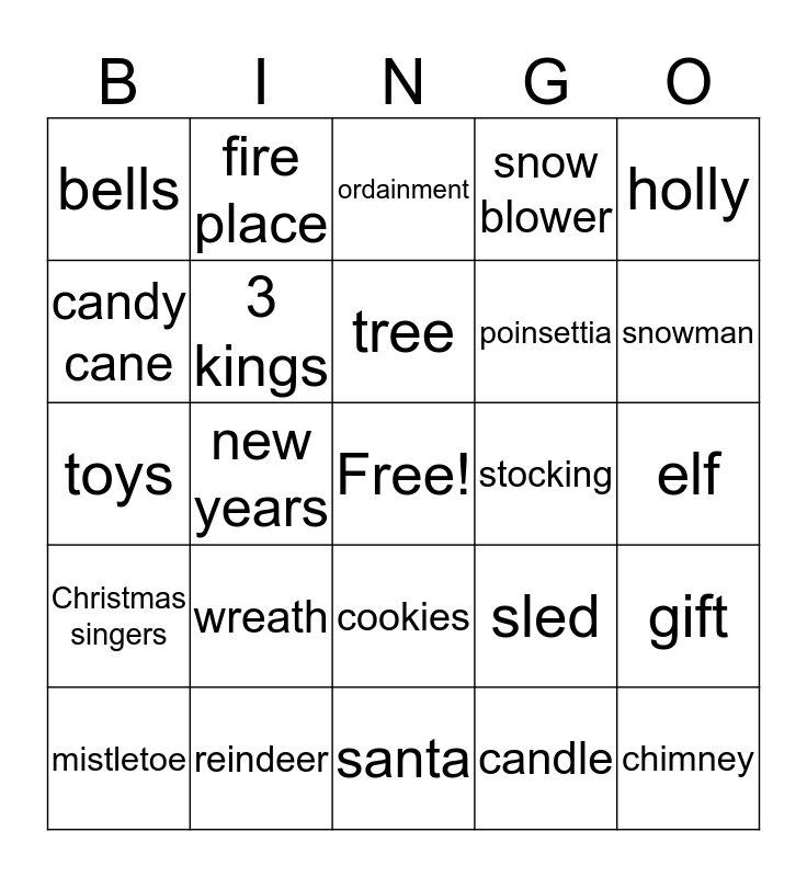 This bingo card has a free space and 24 words: wreath, reindeer, tree, mistletoe, holly, bells, candy cane, fire place, stocking, cookies, poinsettia, toys, sled, gift, 3 kings, candle, elf, ordainment, snowman, new years, chimney, Christmas singers, snow blower and santa.