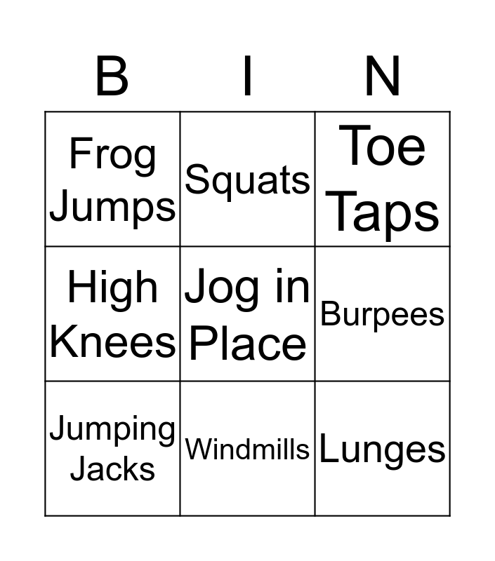 This bingo card has a free space and 14 words: Pushups, Situps, Jumping Jacks, Squats, High Knees, Lunges, Plank, Mountain Climbers, Windmills, Frog Jumps, High Kicks, Burpees, Toe Taps and Rest.