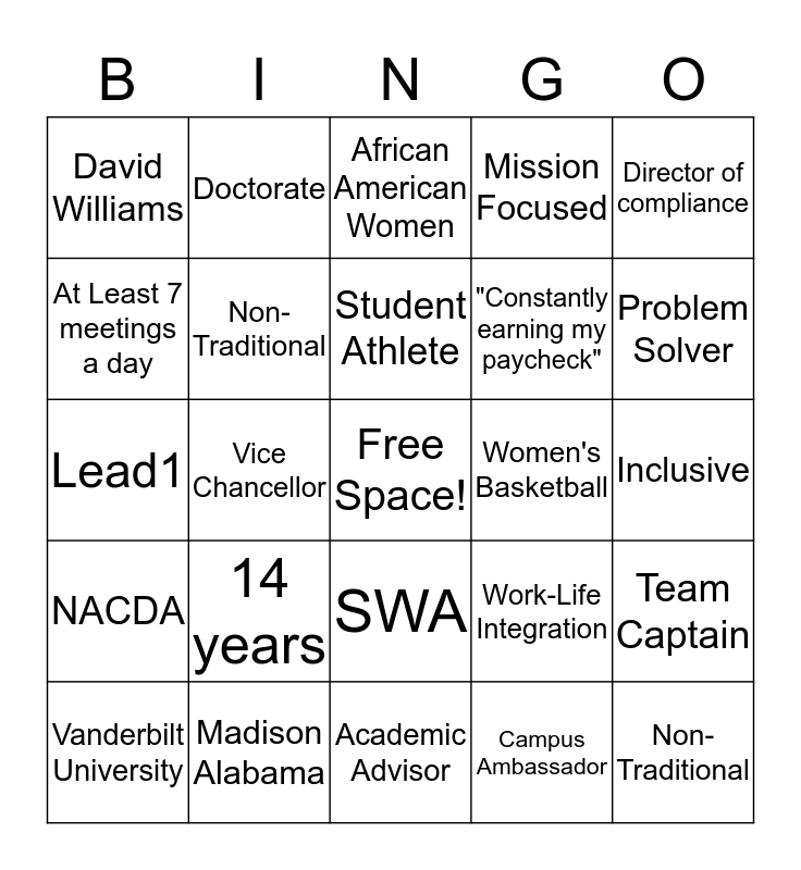 This bingo card has a free space and 24 words: 14 years, Madison Alabama, Student Athlete, Vanderbilt University, Director of compliance, David Williams, At Least 7 meetings a day, Doctorate, Women's Basketball, SWA, "Constantly earning my paycheck", Lead1, Work-Life Integration, Team Captain, Non-Traditional, Campus Ambassador, Inclusive, African American Women, Problem Solver, Vice Chancellor, Non-Traditional, NACDA, Mission Focused and Academic Advisor.