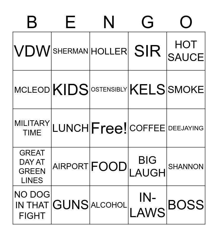 This bingo card has a free space and 24 words: AIRPORT, GUNS, OSTENSIBLY, NO DOG IN THAT FIGHT, HOT SAUCE, VDW, MCLEOD, SHERMAN, COFFEE, FOOD, KELS, MILITARY TIME, BIG LAUGH, SHANNON, KIDS, IN-LAWS, DEEJAYING, HOLLER, SMOKE, LUNCH, BOSS, GREAT DAY AT GREEN LINES, SIR and ALCOHOL.