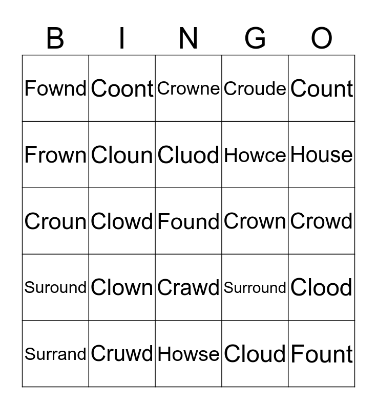 This bingo card has 25 words: Clown, Howse, Cluod, Surrand, Count, Fownd, Frown, Coont, Crown, Crawd, Howce, Croun, Surround, Clood, Cloun, Fount, Crowd, Crowne, House, Clowd, Found, Cruwd, Suround, Croude and Cloud.