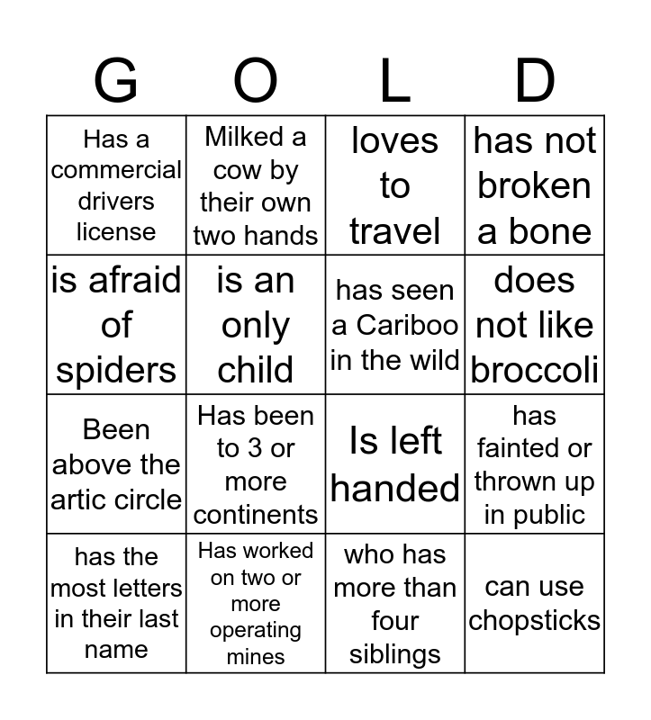 This bingo card has 37 words: Free!, hasn't had breakfast today, enjoys math, has seen a Cariboo in the wild, likes very spicy food, was born in January, does not like broccoli, drank coffee this morning, is afraid of spiders, Played in the marching band, has fainted or thrown up in public, has not broken a bone, has the most letters in their last name, who has more than four siblings, is an only child, can use chopsticks, can whistle, loves to travel, Ran a marathon, Has worked on two or more operating mines, Has a commercial drivers license, Has been to 3 or more continents, Owned their own business, Received 2 or more speeding or parking tickets, Can speak a foreign language, Jumped out of an airplane, Milked a cow by their own two hands, Does not have any pets, Has completed a quilt, Alive when president Kennedy was assassinated, Loves cooking, Been on a blind date, Is left handed, Alaska Airlines Gold 75K member, Been to 5 Alaska Villages, Been above the artic circle and Ridden on the Alaska Marine Highway.
