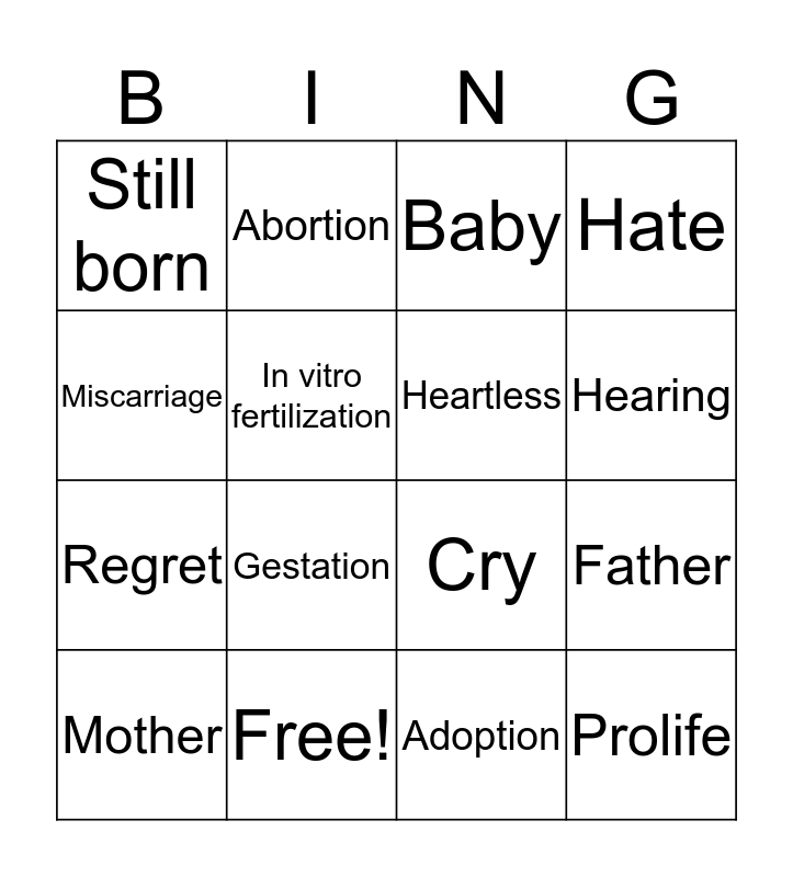 This bingo card has 24 words: Love, Heart, Hearing, Touch, Miscarriage, Still born, In vitro fertilization, Abortion, Free!, Planned parenthood, Regret, Cry, Happy, Heartful, Heartless, Sad, Adoption, Baby, Gestation, Father, Mother, Prolife, Hate and Laugh.