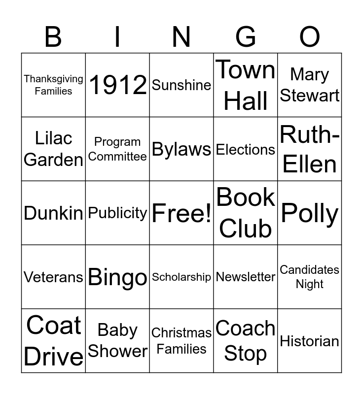 This bingo card has a free space and 31 words: Christmas Families, Craft Fair, Publicity, Yard Sale, Thanksgiving Families, Sunshine, Program Committee, Newsletter, Book Club, Coach Stop, Polly, Historian, Su Bennett, Humanities, Ruth-Ellen, Green and White, Candidates Night, Bingo, Veterans, Scholarship, Mary Stewart, Club Motto, Coat Drive, 1912, Elections, Lilac Garden, Town Hall, Dunkin, Baby Shower, Bylaws and Luncheons.