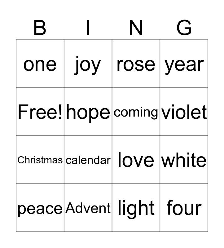 This bingo card has 16 words: Advent, white, rose, one, Christmas, joy, love, light, Free!, hope, peace, year, calendar, violet, coming and four.
