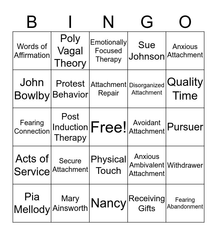 This bingo card has a free space and 24 words: Secure Attachment, Mary Ainsworth, Attachment Repair, Pia Mellody, Anxious Attachment, Words of Affirmation, John Bowlby, Poly Vagal Theory, Avoidant Attachment, Physical Touch, Disorganized Attachment, Fearing Connection, Anxious Ambivalent Attachment, Withdrawer, Protest Behavior, Receiving Gifts, Pursuer, Emotionally Focused Therapy, Quality Time, Post Induction Therapy, Fearing Abandonment, Acts of Service, Sue Johnson and Nancy.