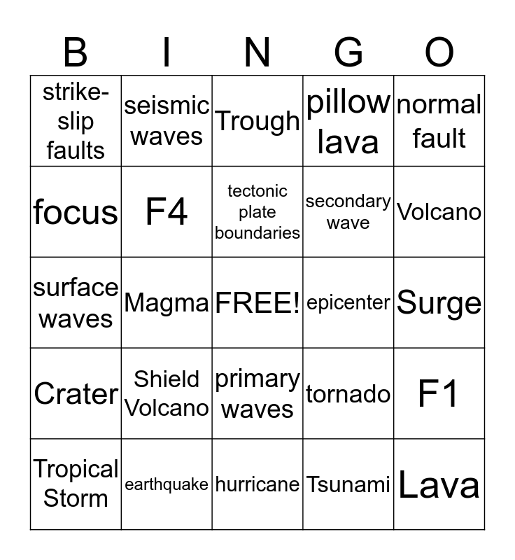 This bingo card has a free space and 24 words: Shield Volcano, earthquake, tectonic plate boundaries, Tropical Storm, normal fault, strike-slip faults, focus, seismic waves, epicenter, primary waves, secondary wave, surface waves, tornado, F1, F4, Tsunami, Surge, Trough, Volcano, Magma, Lava, Crater, pillow lava and hurricane.