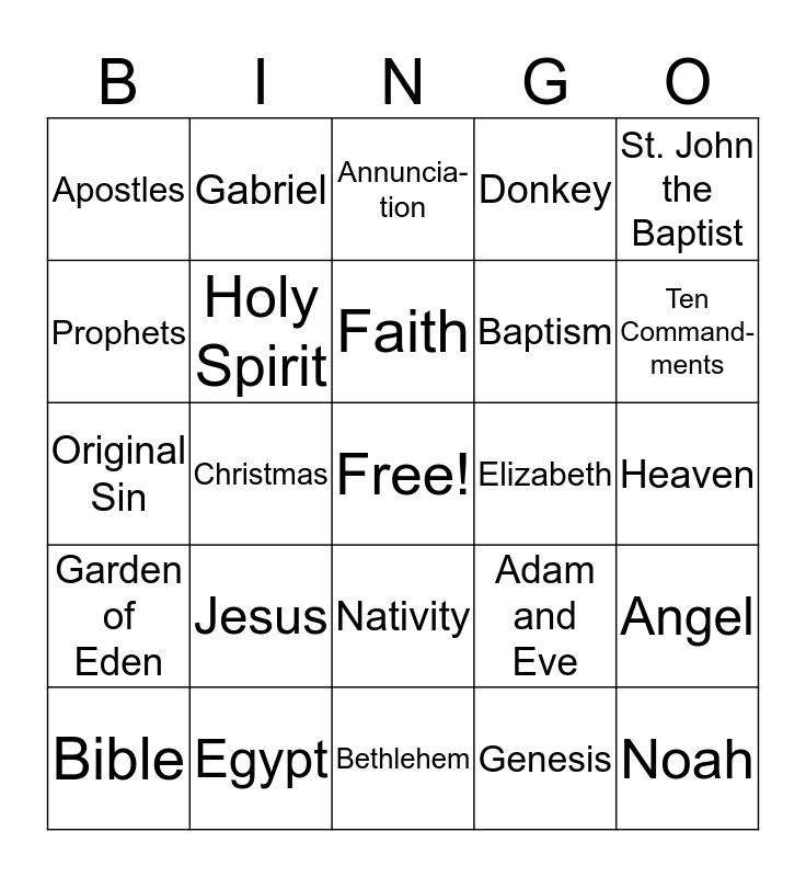 This bingo card has a free space and 25 words: Jesus, Bethlehem, Faith, Bible, St. John the Baptist, Apostles, Prophets, Gabriel, Elizabeth, Nativity, Baptism, Original Sin, Adam and Eve, Angel, Holy Spirit, Last Supper, Heaven, Annuncia-tion, Ten Command-ments, Christmas, Noah, Egypt, Garden of Eden, Donkey and Genesis.