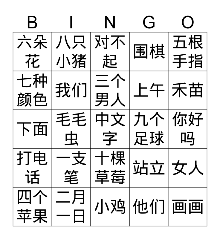 This bingo card has a free space and 24 words: 一支笔, 二月一日, 三个男人, 四个苹果, 五根手指, 六朵花, 七种颜色, 八只小猪, 九个足球, 十棵草莓, 上午, 下面, 站立, 女人, 我们, 他们, 你好吗, 对不起, 禾苗, 毛毛虫, 画画, 打电话, 围棋 and 小鸡.