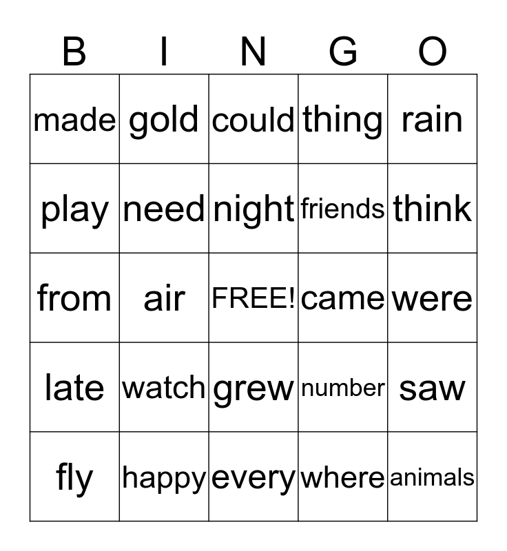 This bingo card has a free space and 24 words: watch, happy, night, fly, rain, made, play, gold, came, grew, friends, from, number, saw, need, where, were, could, think, air, animals, late, thing and every.