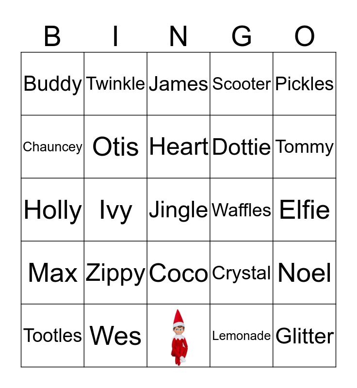 This bingo card has 1 images and 29 words: Skittles, Otis, Lucy, Scooter, Pickles, Buddy, Zippy, Jingle, Lemonade, Noel, Chauncey, Sam, Tinsel, Crystal, Glitter, Holly, Ivy, Coco, Dottie, Elfie, Tootles, Twinkle, Heart, Waffles, Tommy, Max, Wes, James and Ginger.