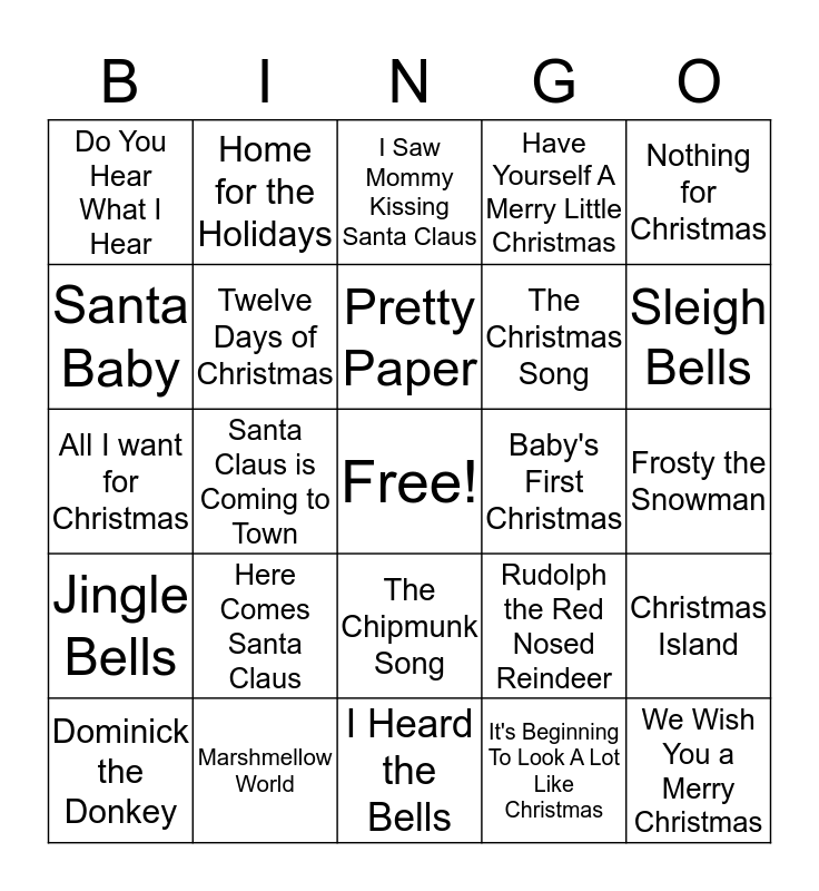 This bingo card has a free space and 24 words: Here Comes Santa Claus, Marshmellow World, Pretty Paper, Dominick the Donkey, Nothing for Christmas, Do You Hear What I Hear, Santa Baby, Home for the Holidays, Baby's First Christmas, The Chipmunk Song, The Christmas Song, All I want for Christmas, Rudolph the Red Nosed Reindeer, Christmas Island, Twelve Days of Christmas, It's Beginning To Look A Lot Like Christmas, Frosty the Snowman, I Saw Mommy Kissing Santa Claus, Sleigh Bells, Santa Claus is Coming to Town, We Wish You a Merry Christmas, Jingle Bells, Have Yourself A Merry Little Christmas and I Heard the Bells.