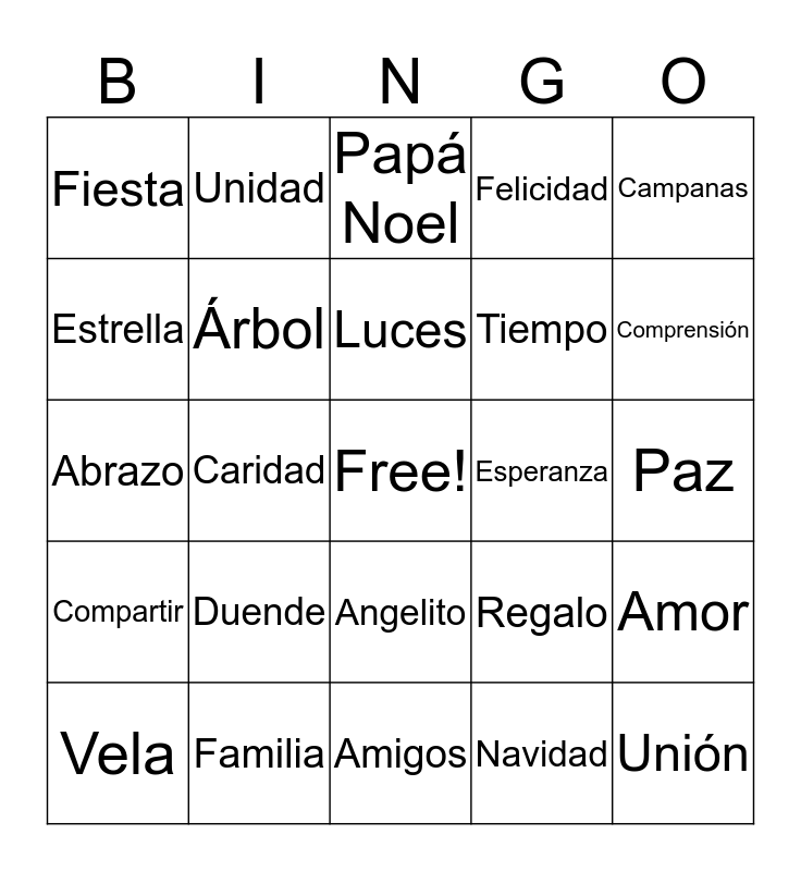 This bingo card has a free space and 24 words: Duende, Familia, Luces, Vela, Campanas, Fiesta, Estrella, Unidad, Esperanza, Angelito, Tiempo, Abrazo, Regalo, Amor, Árbol, Navidad, Paz, Papá Noel, Comprensión, Caridad, Unión, Compartir, Felicidad and Amigos.
