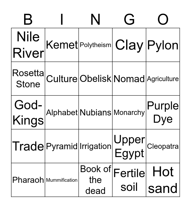 This bingo card has 25 words: Pyramid, Book of the dead, Obelisk, Pharaoh, Pylon, Nile River, Rosetta Stone, Kemet, Monarchy, Irrigation, Nomad, God-Kings, Upper Egypt, Cleopatra, Culture, Hot sand, Purple Dye, Polytheism, Agriculture, Alphabet, Nubians, Mummification, Trade, Clay and Fertile soil.