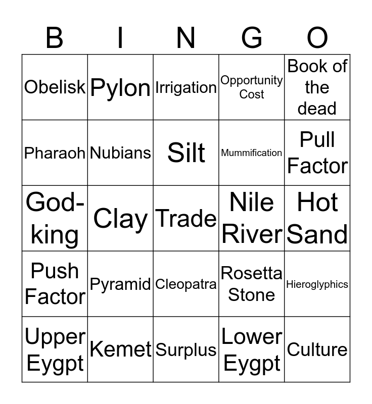 This bingo card has a free space and 24 words: Pyramid, Kemet, Silt, Upper Eygpt, Book of the dead, Obelisk, Pharaoh, Pylon, Nile River, Cleopatra, Mummification, God-king, Rosetta Stone, Hieroglyphics, Nubians, Lower Eygpt, Hot Sand, Irrigation, Pull Factor, Clay, Culture, Push Factor, Opportunity Cost and Surplus.