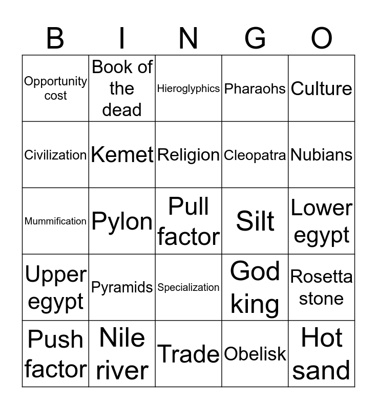 This bingo card has a free space and 24 words: Pyramids, Nile river, Religion, Push factor, Culture, Opportunity cost, Civilization, Book of the dead, Silt, Specialization, Cleopatra, Mummification, God king, Rosetta stone, Kemet, Obelisk, Lower egypt, Hieroglyphics, Nubians, Pylon, Hot sand, Upper egypt, Pharaohs and Trade.