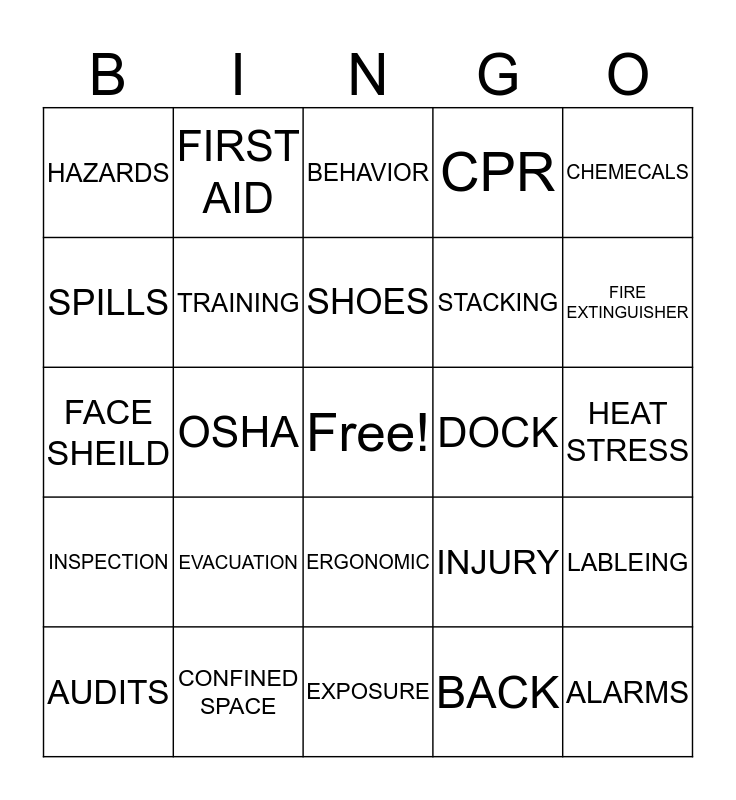 This bingo card has a free space and 45 words: AED, ALARMS, ALERT, AUDITS, AWAKE, BACK, BEHAVIOR, BRAKES, CHEMECALS, CONFINED SPACE, CPR, DOCK, ERGONOMIC, EVACUATION, EXITS, EXPOSURE, EYEWASH, FACE SHEILD, FATIGUE, FIRE EXTINGUISHER, FIRST AID, GLASSES, GUARDS, HAZARDS, HAZ-WASTE, HEAT STRESS, HOUSE KEEPING, INCIDENT, INJURY, INSPECTION, INVOLVED, LABLEING, LIFTING, MASK, MSDS, OSHA, OXYGEN, PPE, SECURITY, SHOES, SPILLS, STACKING, SUGJESTIONS, TRAINING and VEST.