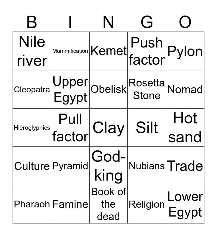 This bingo card has 25 words: Pyramid, Book of the dead, Obelisk, Pharaoh, Pylon, Nile river, Cleopatra, Mummification, Silt, God-king, Rosetta Stone, Hieroglyphics, Nubians, Trade, Upper Egypt, Lower Egypt, Hot sand, Kemet, Nomad, Pull factor, Clay, Famine, Culture, Push factor and Religion.
