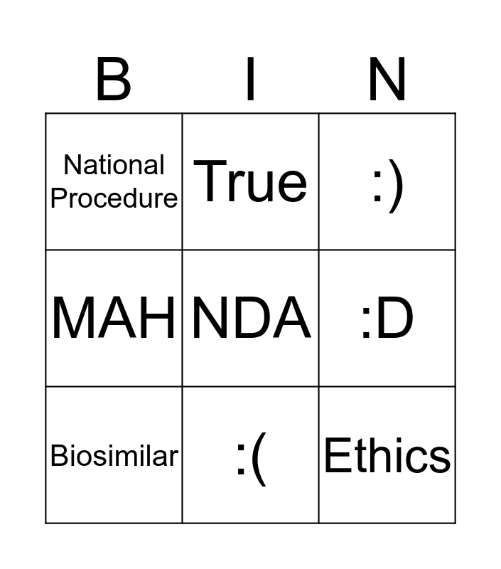 This bingo card has 9 words: Biosimilar, :), True, MAH, National Procedure, :D, NDA, Ethics and :(.