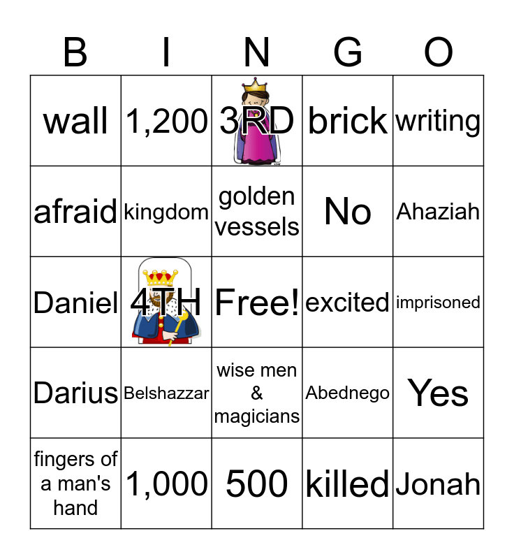 This bingo card has 2 images, a free space and 24 words: Belshazzar, 1,000, golden vessels, fingers of a man's hand, writing, wall, afraid, 1,200, excited, wise men & magicians, No, Daniel, Abednego, Yes, kingdom, killed, imprisoned, 3RD, Ahaziah, 4TH, Jonah, Darius, brick and 500.