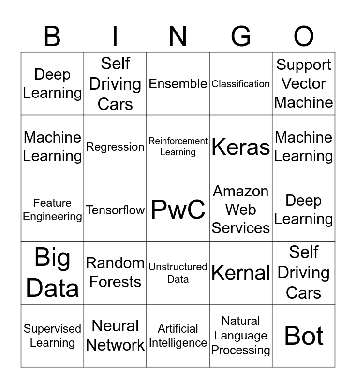 This bingo card has a free space and 24 words: Random Forests, Neural Network, Reinforcement Learning, Supervised Learning, Support Vector Machine, Deep Learning, Machine Learning, Self Driving Cars, Amazon Web Services, Unstructured Data, Keras, Feature Engineering, Kernal, Self Driving Cars, Regression, Natural Language Processing, Deep Learning, Ensemble, Machine Learning, Tensorflow, Bot, Big Data, Classification and Artificial Intelligence.