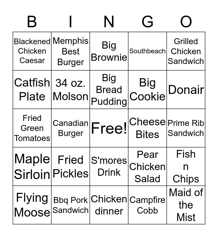 This bingo card has a free space and 24 words: Fried Pickles, Bbq Pork Sandwich, Big Bread Pudding, Flying Moose, Grilled Chicken Sandwich, Blackened Chicken Caesar, Catfish Plate, Memphis Best Burger, Cheese Bites, S'mores Drink, Big Cookie, Fried Green Tomatoes, Pear Chicken Salad, Fish n Chips, 34 oz. Molson, Campfire Cobb, Prime Rib Sandwich, Big Brownie, Donair, Canadian Burger, Maid of the Mist, Maple Sirloin, Southbeach and Chicken dinner.
