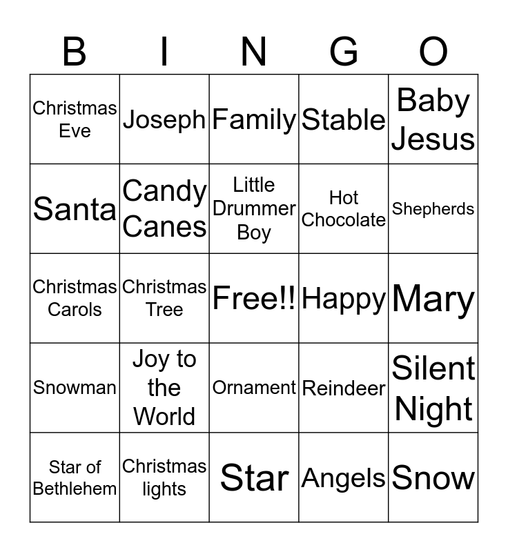 This bingo card has a free space and 29 words: Star of Bethlehem, Toys, Christmas Tree, Wise men, Christmas Eve, Family, Candy Canes, Joy to the World, Happy, Christmas lights, Mary, Snow, Star, Angels, Shepherds, Cookies, Ornament, Snowman, Baby Jesus, Christmas Carols, Reindeer, Stockings, Hot Chocolate, Santa, Stable, Joseph, Silent Night, Little Drummer Boy and The First Noel.