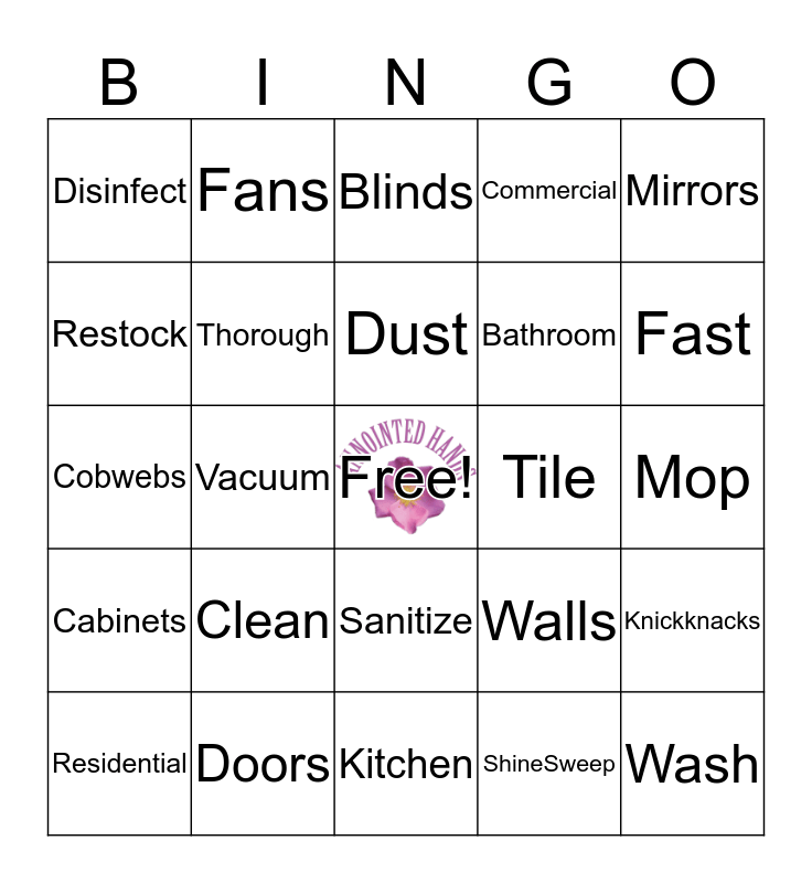This bingo card has a free space and 27 words: Walls, Partitions, Bathroom, Kitchen, Restock, Blinds, Fans, Cabinets, Tile, Knickknacks, Cobwebs, Commercial, Residential, Doors, Fast, Friendly, Thorough, Dust, Clean, Disinfect, Mop, ShineSweep, Vacuum, Wash, Sanitize, Mirrors and Glass.