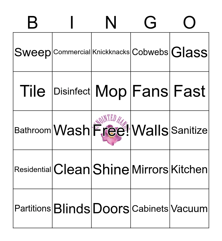 This bingo card has a free space and 28 words: Kitchen, Restock, Fans, Cabinets, Tile, Knickknacks, Commercial, Residential, Walls, Partitions, Bathroom, Cobwebs, Blinds, Doors, Fast, Friendly, Clean, Disinfect, Mop, Shine, Sweep, Thorough, Vacuum, Wash, Sanitize, Mirrors, Glass and Dust.