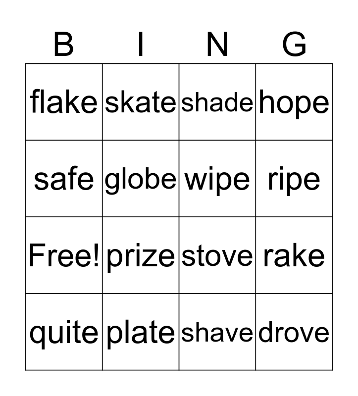 This bingo card has 20 words: rake, slide, shade, slope, quite, safe, plate, flake, Free!, skate, prize, stove, globe, drove, wipe, mile, ripe, hope, shave and poke.