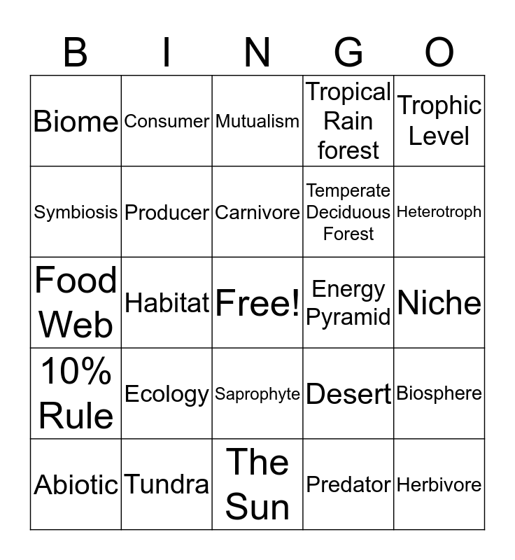 This bingo card has a free space and 24 words: Ecology, Tundra, Carnivore, Abiotic, Trophic Level, Biome, Symbiosis, Consumer, Energy Pyramid, Saprophyte, Temperate Deciduous Forest, Food Web, Desert, Biosphere, Producer, Predator, Niche, Mutualism, Heterotroph, Habitat, Herbivore, 10% Rule, Tropical Rain forest and The Sun.