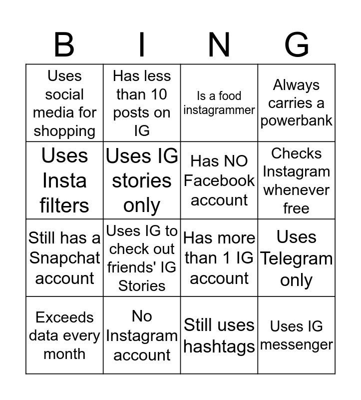 This bingo card has 16 words: No Instagram account, Uses Telegram only, Is a food instagrammer, Uses social media for shopping, Still has a Snapchat account, Has less than 10 posts on IG, Has more than 1 IG account, Still uses hashtags, Uses Insta filters, Uses IG stories only, Exceeds data every month, Always carries a powerbank, Uses IG to check out friends' IG Stories, Checks Instagram whenever free, Has NO Facebook account and Uses IG messenger.