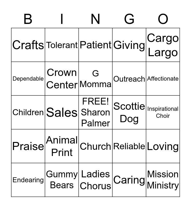 This bingo card has a free space and 41 words: Family, Children, Neighbor, Crown Center, Gummy Bears, Church, G Momma, Bargain, Cargo Largo, Praise, Sales, Giving, Mission Ministry, Inspirational Choir, Scottie Dog, Animal Print, Child Care, Crafts, Shopping, Patient, Loving, Morning Snacks, Ladies Chorus, Outreach, Warm, Adoring, Caring, Devoted, Affectionate, Tender, Classy, Tolerant, Endearing, Long-suffering, Reliable, Dependable, Charitable, Generous, Open-handed, Benevolent and Lovable.