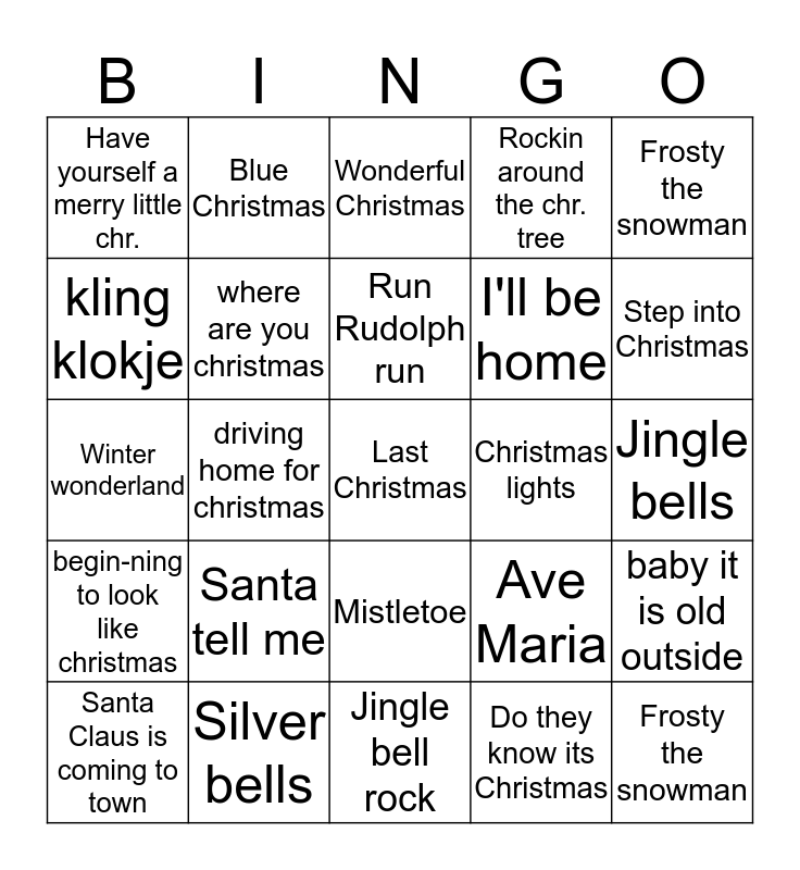 This bingo card has 44 words: All I want for Christmas is you, Last Christmas, Mary's boy child, Santa Claus is coming to town, Santa Baby, Do they know its Christmas, Wonderful Christmas, Rudolph the red nosed reindeer, Frosty the snowman, Silver bells, Rockin around the chr. tree, Christmas lights, Mistletoe, Santa tell me, the most wonder-ful time of the year, Jingle bell rock, Feliz Navidad, Winter wonderland, Sleigh ride, Step into Christmas, Blue Christmas, Little Drummer boy, Silent night, Have yourself a merry little chr., oh denne-boom, Jingle bells, Christmas Hearts, Santa's party, Ave Maria, begin-ning to look like christmas, let is snow, baby it is old outside, Christmas, Underneath the tree, driving home for christmas, Happy Xmas, i saw mommy kissing Santa, Frosty the snowman, Run Rudolph run, kling klokje, I'll be home, my only wish, where are you christmas and The first Noel.