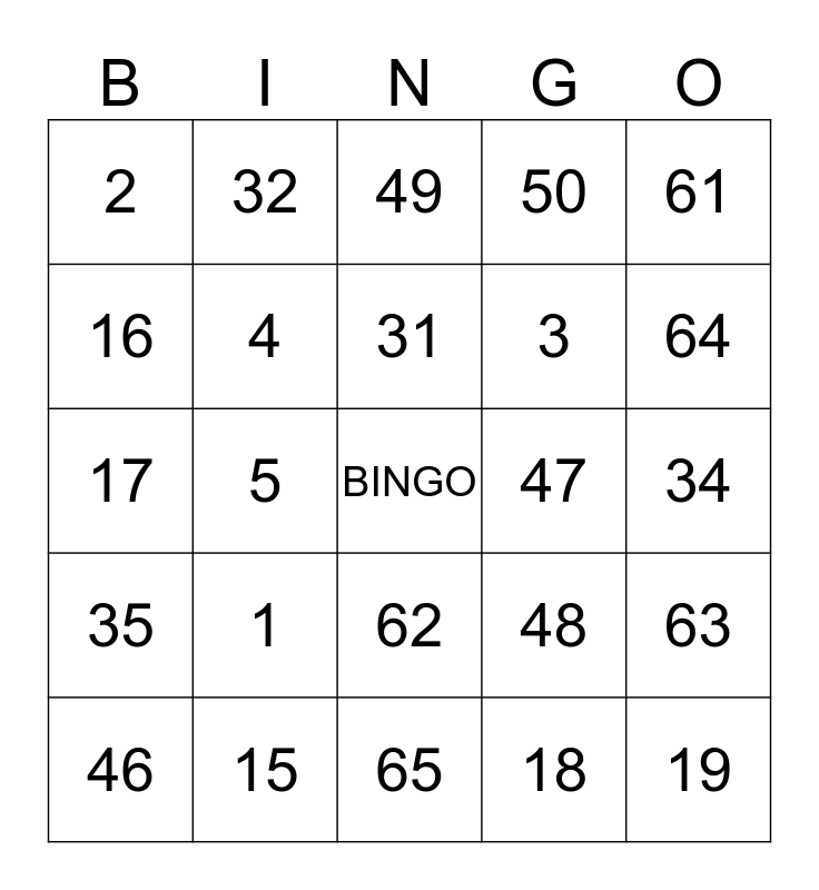 This bingo card has a free space and 24 words: 1, 15, 31, 46, 61, 2, 16, 32, 47, 62, 3, 17, 48, 63, 4, 18, 34, 49, 64, 5, 19, 35, 50 and 65.