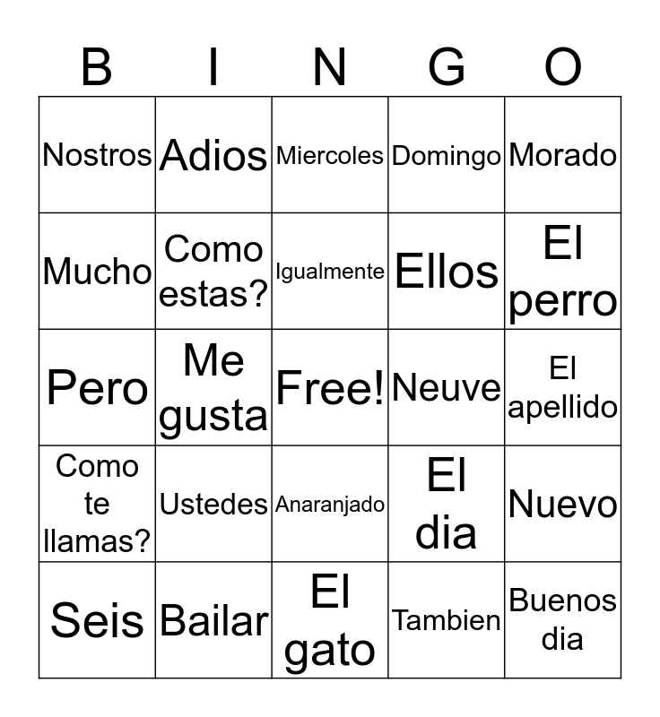 This bingo card has a free space and 24 words: Ustedes, Bailar, Igualmente, Seis, Morado, Nostros, Mucho, Adios, Neuve, Anaranjado, Ellos, Pero, El dia, Nuevo, Como estas?, Tambien, El apellido, Miercoles, El perro, Me gusta, Buenos dia, Como te llamas?, Domingo and El gato.