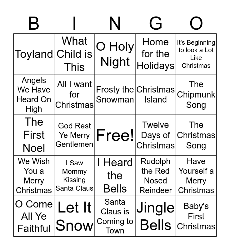 This bingo card has a free space and 24 words: I Saw Mommy Kissing Santa Claus, Let It Snow, Frosty the Snowman, O Come All Ye Faithful, It's Beginning to look a Lot Like Christmas, Toyland, Angels We Have Heard On High, What Child is This, Twelve Days of Christmas, I Heard the Bells, Christmas Island, The First Noel, Rudolph the Red Nosed Reindeer, Have Yourself a Merry Christmas, All I want for Christmas, Jingle Bells, The Christmas Song, O Holy Night, The Chipmunk Song, God Rest Ye Merry Gentlemen, Baby's First Christmas, We Wish You a Merry Christmas, Home for the Holidays and Santa Claus is Coming to Town.
