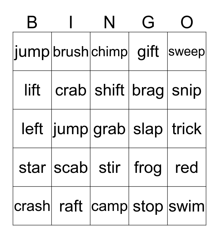This bingo card has 31 words: camp, lamp, jump, bump, jump, chimp, crab, frog, slap, stop, trick, grab, swim, skip, snip, spot, red, scab, star, stir, sweep, crib, crash, brush, brag, lift, gift, left, raft, shift and loft.