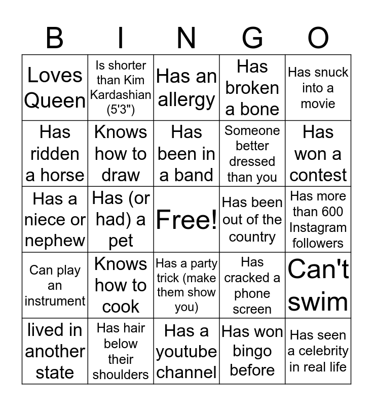 This bingo card has a free space and 29 words: lived in another state, has more than one sibling, Has (or had) a pet, plays a sport, Loves Queen, Has an allergy, Knows how to draw, Knows how to cook, Has been out of the country, Has hair below their shoulders, Has more than 600 Instagram followers, Has seen a celebrity in real life, Has a youtube channel, Has won bingo before, Has won a contest, Went on a road trip, Has a party trick (make them show you), Can play an instrument, Has snuck into a movie, Has a niece or nephew, Has cracked a phone screen, Has kept a plant alive, Someone better dressed than you, Has ridden a horse, Has broken a bone, Is shorter than Kim Kardashian (5'3"), Can't swim, Has been in a band and Has a good singing voice.
